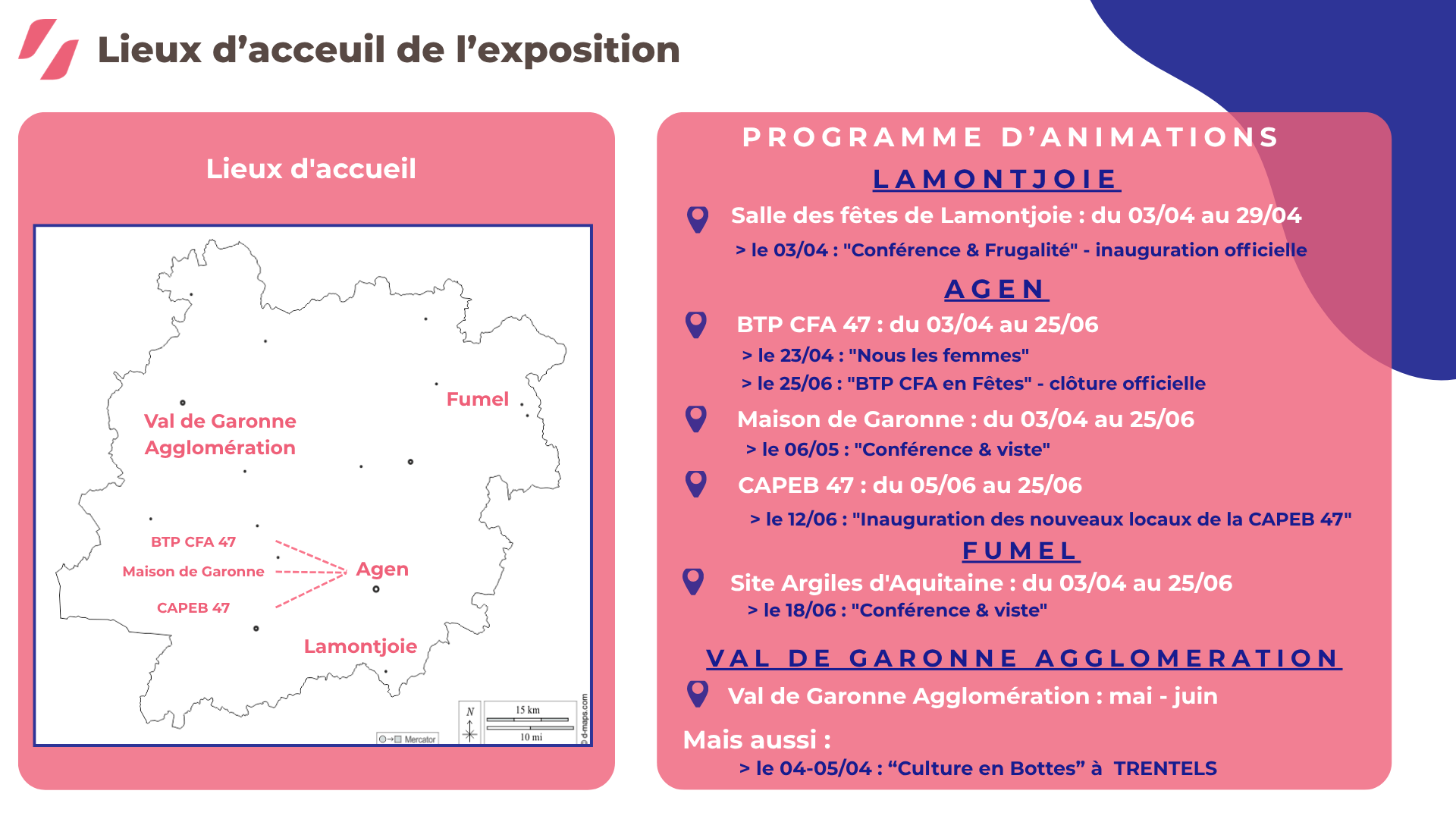 Ce lancement marque le début d’un cycle d’événements qui se poursuivra jusqu’au 25 juin 2026, avec une clôture prévue au BTP CFA 47 à Agen. D’ici là, l’exposition circulera dans plusieurs sites du Lot-et-Garonne, permettant une diffusion multisite et une appropriation par différents publics. L'exposition se décline en dix thématiques qui seront réparties sur les différents sites du territoire : habiter, apprendre, réhabiliter, ou encore aménager.