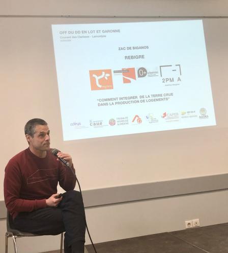 - REBIGRE à Biganos (33), présenté par Matthieu Bergeret de l'agence 2PM A : un projet mettant en lumière l’intégration de la terre crue dans la production de logements/bureaux et la valorisation des ressources locales