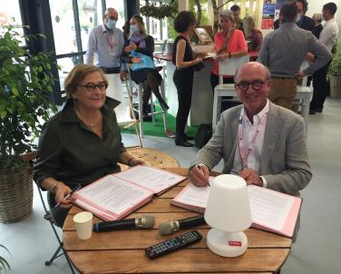 Muriel BOULMIER, Présidente de l’UR Hlm NA et Alain DENAT, Président délégué d’Odéys. Le 29 septembre, dans le cadre du congrès USH de Bordeaux, Odéys