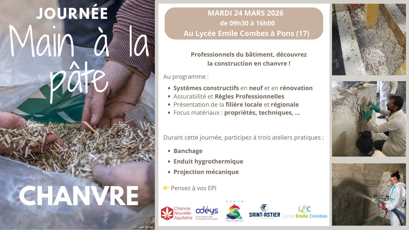 Chanvre Nouvelle-Aquitaine, Odéys, la Communauté de communes de la Haute-Saintonge, Chaux de Saint-Astier et le Lycée Emile Combes ont le plaisir de vous convier à une journée "main à la pâte" pour découvrir la construction en chanvre.