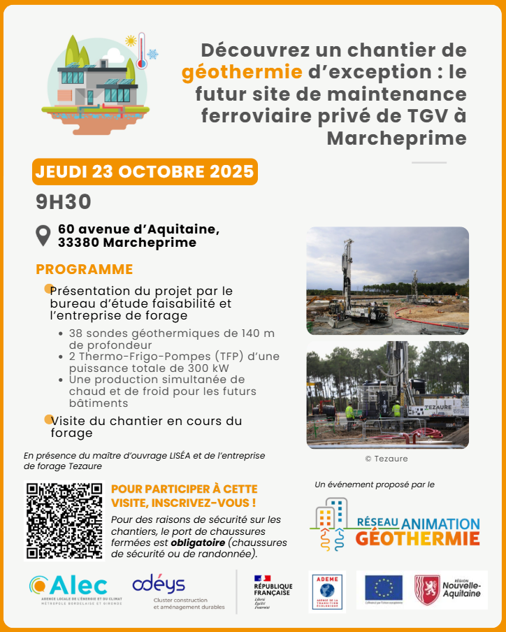 L’Alec 33 et Odéys vous invitent à découvrir un chantier de géothermie d’exception, sur le futur site de maintenance ferroviaire privé de TGV à Marcheprime.